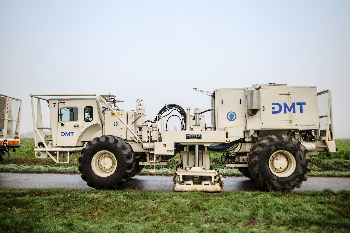 Ein Vibrotruck sendet über die Stempelplatte seismische Impulse in den Untergrund.
