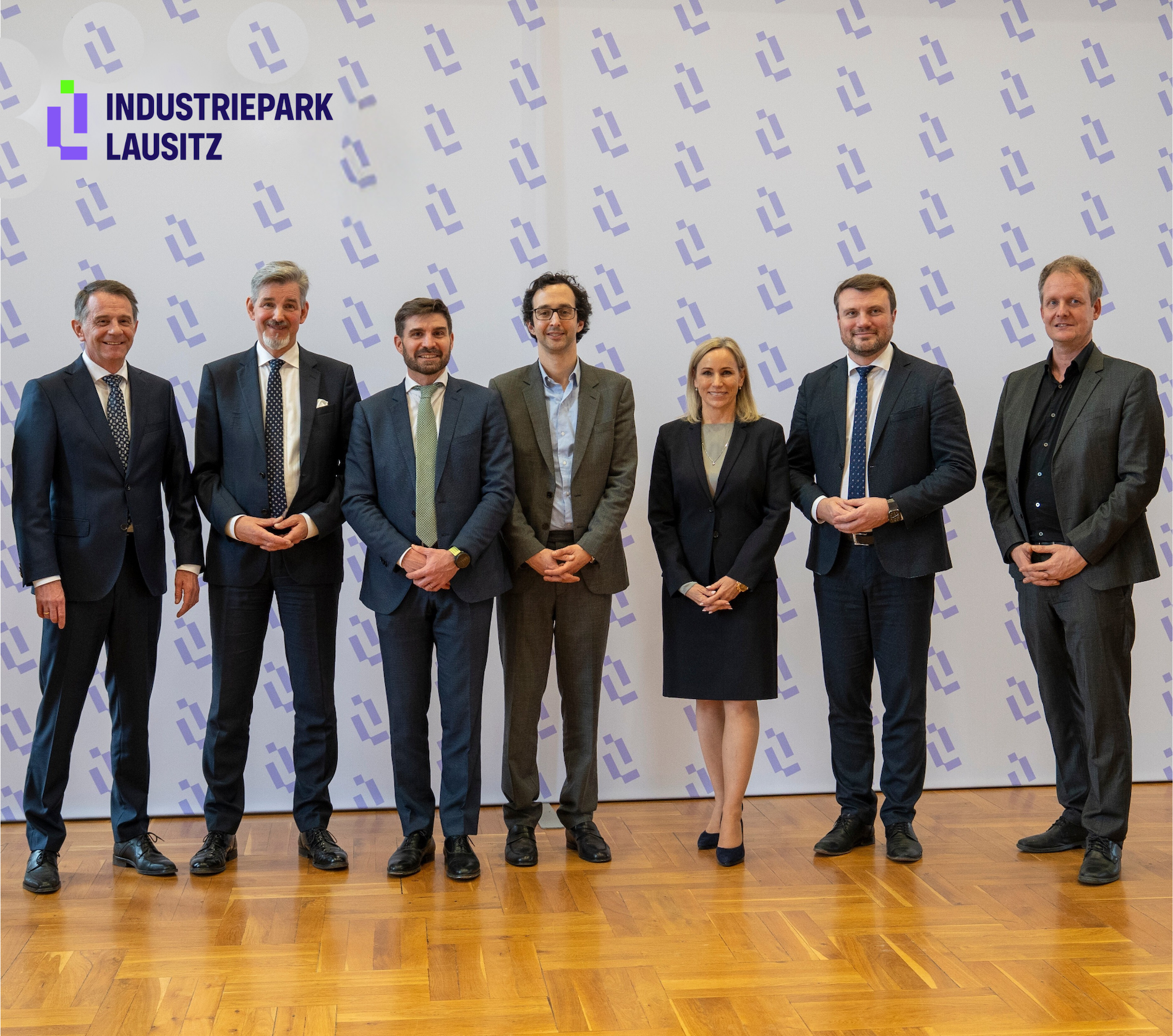 Von links: Jürgen Fuchs, Vorsitzender Geschäftsführung BASF InfraService & Solutions Lausitz GmbH, Dr. Steffen Kammradt, Geschäftsführer Wirtschaftsförderung Land Brandenburg GmbH, Antoine Boussard, CEO Infinite Loop Europe, Julien Touati, CEO Reed – Société Générale Group, Vera Felbermayer, Vice President Infrastructure & Technical Services, BASF InfraService & Solutions Lausitz GmbH, Daniel Keller, Wirtschaftsminister Brandenburg, Philipp Ruta, Wirtschaftsförderung Land Brandenburg GmbH.