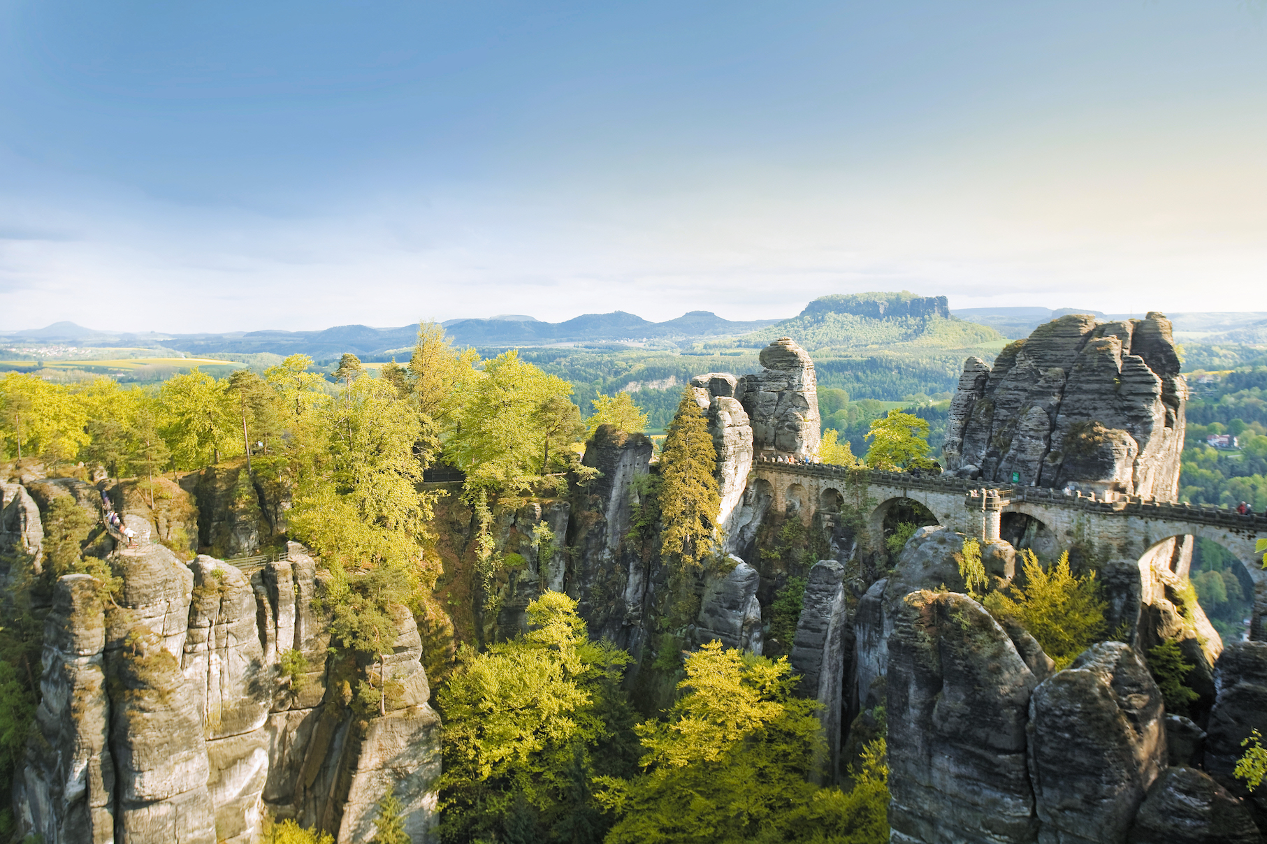 Wandern im Nationalpark Sächsische Schweiz: Blick auf die Basteibrücke Nur wenige Kilometer von Dresden entfernt, erhebt sich die wildromantische Felsenwelt des Elbsandsteingebirges. Der hier befindliche Nationalpark Sächsische Schweiz ist der einzige Felsennationalpark Deutschlands. Wanderer entdecken majestätische Tafelberge, bizarre Gesteinsformationen und verwunschene Gründe. Eines der beliebtesten Ausflugsziele ist die Bastei, von der Besucher einen unvergleichlichen Blick über das malerische Elbtal genießen. Durch die Felsformation zieht sich eine 76,5 m lange Brücke. Über die 1851 aus Sandstein erbaute Konstruktion gelangt man zudem auch zur bekannten Ruine der Felsenburg Neurathen. Sie ist die größte mittelalterliche Felsenburg der Region.