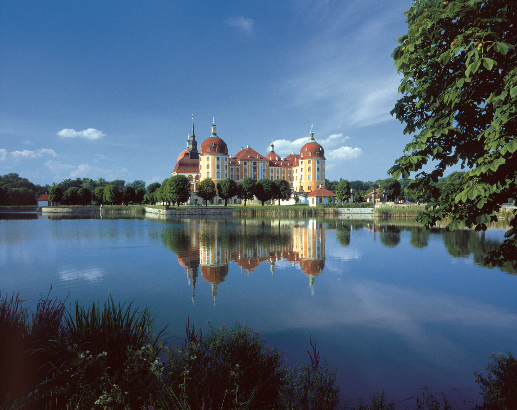 Wasserspiegelung von Schloss Moritzburg Das Schloss Moritzburg liegt in der gleichnamigen Gemeinde Moritzburg nahe Dresden. Das auf ein Jagdhaus des 16. Jahrhunderts zurückgehende Jagdschloss erhielt seine heutige Gestalt im 18. Jahrhundert unter August dem Starken. Das Schloss, dessen Hauptachse von Süd nach Nord verläuft, erhebt sich auf einer künstlichen Insel im Schlossteich. Der barocke Vierflügelbau mit seinen vier direkt mit dem Hauptbau verbundenen Türmen ruht auf einem podestartigen Sockelgeschoss. Acht ehemalige Wachhäuschen sind auf der Insel rings um das Schloss gruppiert. Die harmonische Landschaftsintegration des Schlosses wird vervollständigt durch die sich nördlich anschließende Gartenanlage, das etwa zwei Kilometer östlich liegende und durch eine direkte Sichtachse verbundene Fasanenschlösschen mit kleiner Hafenanlage und dem Venusbrunnen, die Dardanellen sowie ein Hellhaus im Zentrum des Schneisensterns im nördlichen Friedewald.